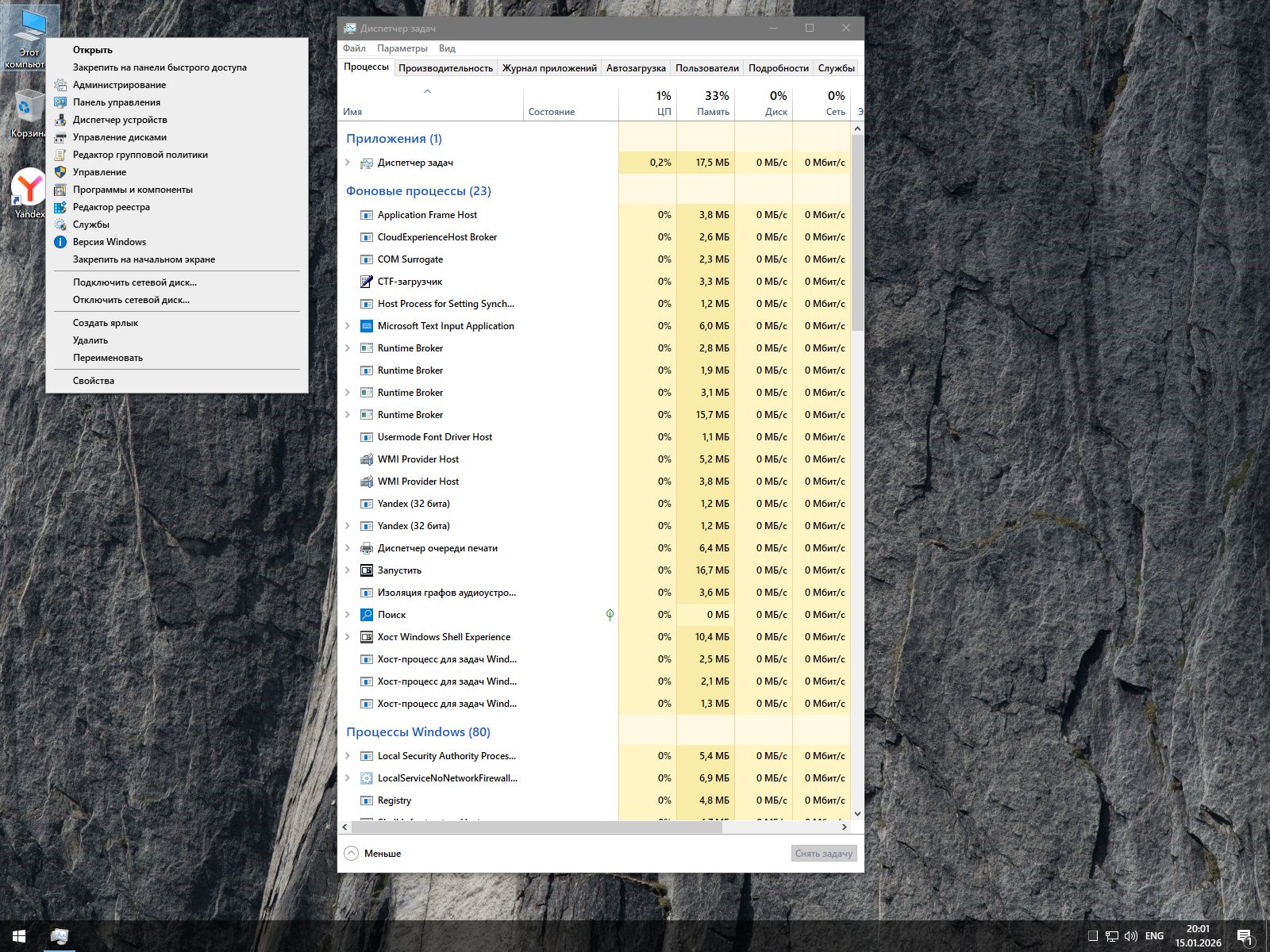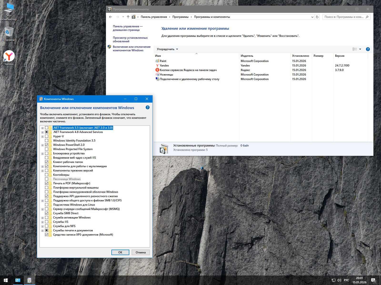 • Родной обозреватель Edge. Он нарушает конфиденциальность, отправляя историю открытия страниц и загрузок в Microsoft. Вместо него автор добавил в образ Yandex. Он проставится вместе с ОС. Это самый популярный в рунете браузер с дополнительными функциями в виде голосовой ассистенткой Алисой и нейросетями для работы с изображениями и текстами.